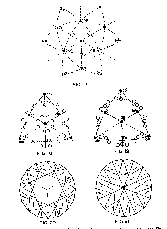 FIGS. 17-21. Projections showing a diamond crystal cut as a three-point brilliant. Fig. 17, stereographic projection showing hardness variation; Figs. 18 and 19, location of crown and pavilion facets, respectively; Figs. 20 and 21, optimum polishing directions of crown and pavilion facets, respectively.