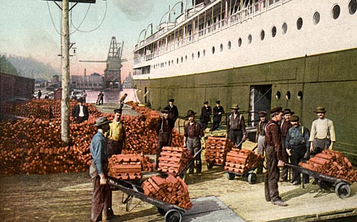 The ingots from the Isle Royale Mine in Houghton were loaded aboard steamer Juaniata for shipment on the Great Lakes for further refining and fabrication. The copper from the district was known for its purity and much of the copper found its way into the wire that was used for the electrification of the U.S. The Great Lakes were closed to navigation between November and May, so the entire years shipping had to occur during this period.