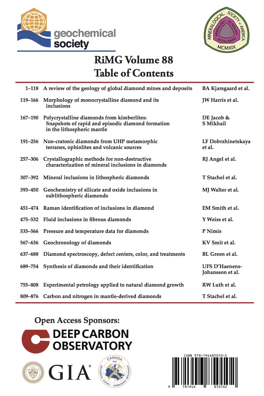 We are grateful to Ian Swainson and Rachel Russell for their patience and dedication to ensuring that the RiMG series remains a product of the highest quality. We thank the Deep Carbon Observatory for bringing the diamond community together at so many meetings, all facilitated by the Sloan Foundation, who part-financed the Open Access for this volume. Thank you also to the Geological Survey of Canada and the Gemological Institute of America who provided further Open Access funds for this volume.
