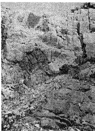 FIG. 3. Barren quartz pillar near center of Baringer Hill pegmatite. MINERALS OF THE PEGMATIVE RARE EARTH MINERALS. The rare earth minerals are quantitatively insignificant, and Hess has estimated that they form but a small fraction of one per cent of the mass of the pegmatite.9 Consequently it is very difficult to find them in place. Professor Bullard and the writer had their best success in collecting specimens of the rarer minerals from a spot a number of yards southwest of the hill where the miners had cobbed and sorted the minerals. The most abundant of the specimens so obtained was allanite. This mineral tends to form large masses rather than veins. One such mass was reported to have weighed over 300 pounds.10 Surrounding the allanite were albite and radially shattered quartz. Gadolinite has been found in masses up to 200 pounds.11 This mineral is heavy and black in color, as allanite, but differs from that mineral in having an irregular, instead of a smooth conchoidal, fracture. The gadolinite masses collected were associated with cyrtolite, fergusonite, and albite. Fergusonite remains fresh longer than the associated gadolinite and albite. It has a typical liver-brown color and a few specimens had a coating of autunite. Some of the fergusonite was found in radially shattered iron-stained quartz. Cyrtolite, one of the more abundant rare earth minerals at Baringer Hill, is readily distinguished from the other minerals in the pegmatite by its curved crystal faces. It is generally surrounded by albite. Cyrtolite is of especial interest because it is now considered the most important source of hafnium,12 and the submergence of Baringer Hill will make one of the possible sources of this mineral no longer accessible. Some small grains of uraninite (nivenite) were found among the material collected. They were invariably surrounded by a brick-red substance with a resinous luster which has heretofore been called gummite. However, it had an index higher than 1.71 which does not accord with the usual published data for gummite. A number of other rare earth minerals are listed by Hess,13 including yttrialite, rowlandite, polycrase, and mackintoshite and several oxidation products beside autunite and gummite. OTHER MINERALS. The minerals of the normal pegmatite, microcline and quartz, are of course of greatest quantitative importance. Where the normal pegmatite lies in contact with the red rock the border between the two is a replacive one with quartz and microcline the host minerals (Fig. 4). No orthoclase was noted among the feldspar specimens collected by the writer. Fluorite occurs both in the quartz, where crystals measuring a foot across have been obtained ,14 and in the red rock. Albite is of greatest abundance in the red rock and it also occurs in crystals lining cavities.15 One specimen collected by the writer contained a large number of drusy albite crystals with maximum dimensions of two centimeters. Quartz occurs in two generations. The earlier quartz is that of the normal pegmatite and the peripheral graphic granite, while the later quartz occurs in the red rock and in crystals in cavities. Regarding the latter occurrence Hidden says: "A cavity into which a horse could have been put was discovered on the river side of the mine and from it a large crystal of smoky quartz was taken that weighed over 600 pounds."16 Hidden also found amethysts occurring in cavities in feldspar. The only other mineral in abundance in the pegmatite is magnetite. It cuts through the red rock in veins averaging about 2 mm. in thickness.