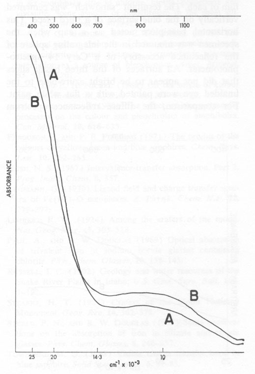 It is clear from Figure 2 why both glass samples are brown in transmitted light. The fact that spectrum A is less intense at ~ 1000 nm but more intense between 400 nm and 600 nm than spectrum B indicates that the glass from the blue layer is richer in Fe3+ than is the glass from the brown zone. (The total iron concentration is the same for both.) Thus, it seems that the outer layer of the lava was oxidized, and that the blue coloration associated with the magnetite particles in some way related to the degree of oxidation of this outer zone. Reflectance Spectra of Film and of the Blue Glass The diffuse reflectance spectrum A in Figure 3 is from freshly cleaned pieces of the lava, approximately half the surface area of which was accounted for by the thin amorphous film. To prepare the sample for spectral measurements, a wafer (~10 cm2) containing the surface film was cut from each of three pieces of basalt. Two of these pieces were cemented back to back, to expose the blue surface film of each. The resultant "sandwich" was cemented vertically on the blue surface of a third piece. This horizontal base-piece acted as a cap when the specimen was mounted in the integrating sphere of the reflectance accessory of a Cary 14 spectrophotometer. All surfaces of the three basalt slices that did not appear to be bright azure-blue to the unaided eye were painted with a flat white paint. For comparison, the diffuse reflectance spectrum (B in Figure 3) was made for a flat piece of basalt from which the siliceous film was ground away to expose the inky-blue glass layer. This spectrum was measured by simply placing the specimen over the sample port of the reflectance accessory. It is less intense than spectrum A because of the smaller area that was irradiated.