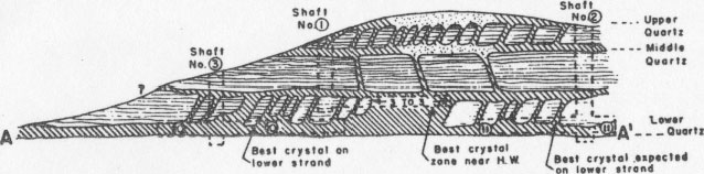 The best production from the upper bed was realized from the central part of the area along a belt parallel to the structural terrace and overlapping its extent towards the crest of the dome. Many parts of the lower bed have been prospected up to this time but the best production has been obtained from a small zone of about 10,000 square meters area, lying in the structural terrace. Small abrupt folds striking northeast-southwest occur in the vicinity of the best crystal (Fig. 9), and tiny quartz-filled joints are present in the shale beds. Prospecting along the trends of folds or groups of joints has been fairly successful. In the outlying part of the district active prospecting along these features has, however, not yet disclosed commercial crystal. Manganese and iron oxides and clay are the only visible minerals accompanying the quartz. The lower bed, for example, consists of massive bull quartz of varying crystallinity, some of the crystals being fairly well-formed. At planes thought to be localized or at least related to the structural features in the shales, manganese staining becomes more prominent and continued work at times leads to a pocket of crystal. The pockets range from a few centimeters in size to several meters and are filled to varying degrees with well-formed crystal not all of which, however, is a commercial product. The commercial crystal characteristically contains "blue needles." Pockets may be within the massive bull quartz or make out into the roof or bottom. There does not appear to be a favored vertical position within the quartz bed for the development of crystal. Enormous quantities of material have been mined at Mimoso. Much of the work, however, has been in an attempt to reach the crystal zone itself so that the ratio of earth moved to crystal produced has depended upon the depth of the bed. At the Rosilho mine, southeast of Mimoso, a steeply dipping vein flattens near the surface to form a blanket of small extent in the country rock which is sandstone. Adjacent to the bull quartz blanket the sandstone is noticeably silicified. This occurrence provides a clear example of wall rock alteration adjacent to a quartz deposit. In general, however, observation of the effects of wall rock alteration is difficult due to the extensive weathering.