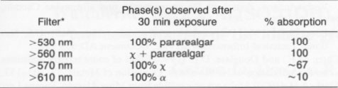 Realgar from all sources was exposed initially to unfiltered sunlight. In order to determine if the alteration was enhanced by various wavelengths, a series of filters was used. A UV-IR pass filter was used initially. This filter blocked out all of the visible spectrum and passed both UV and IR. No transformation occurred after two weeks. This result clearly showed that wavelengths in the visible spectrum were required. Accordingly, long-wavelength-pass filters of 455, 495, 510, 530, 560, 570, and 610 nm were used. In addition, two short-wavelength-pass filters of 500 and 547 nm were used. Several narrow-band-pass filters in the range of interest were employed also. Their characteristics are described with the results of these experiments in Table 1.
