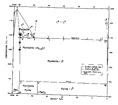 Fig CS-2 Relations among condensed phases in the sulfur-rich portion of the Fe-S system above 700°C. The closed circles are runs which used coexisting sphalerite to determine the phase boundaries as described in the section on Zn-Fe-S. (Modified from Arnold, 1971). Phases Troilite (FeS). Strictly speaking, the name troilite applies only to the polymorph of stoichiometric FeS which is stable below 140°C (Gronvold and Haraldsen, 1952; Yund and Hall, 1968). Above 140°C, FeS has the NiAs (1C) structure of high-temperature hexagonal pyrrhotite whose composition range extends for a considerable distance across the system. Although a common constituent of meteorites, troilite is found only occasionally in terrestrial environments, usually with low-temperature hexagonal pyrrhotite. The solvus separating troilite from other pyrrhotites has been determined most recently by Yund and Hall (1968). Fig. CS-3. Relations among condensed phases in the central portion of the Fe-S system below 350°C. (Kissin, 1974, modified from Scott and Kissin, 1973). Mackinawite (FeS1-x). Evans et al (1964) proposed the name mackinawite for a relatively-rare tetragonal mineral of near-FeS composition. It is found either with troilite or with low-temperature pyrrhotites (Kullerud, 1967) in a wide variety of geological environments including: black iron sulfide muds, contact metasomatic and hydrothermal deposits, bedded cupriferous iron sulfide deposits within metamorphic rocks, in certain ultrabasic rocks and in several lunar rocks (Zoka et al, 7.973). Mackinawite invariably contains some Co and Ni although these elements are not essential as demonstrated by Berner (1964), who precipitated the phase from aqueous iron sulfide solutions between 20° and 95°C. The metal to sulfur ratio in mackinawite is slightly greater than unity (1.04 to 1.07; Takeno and Clark, 1967) and the formula is usually written Fe1+xS. However, Taylor and Finger (1971) have shown that there is a deficiency of sulfur in the structure rather than an excess of metal so the formula is properly FeS1-x. Very little is known about the thermal stability of mackinawite and, for this reason, it is not shown as a stable phase in Fig. CS-1 and CS-3. Zoka et al (1973) found that natural mackinawite from a variety of localities broke down nonisochemically between 120° and 153°C to pyrrhotite of a more S-rich composition. They concluded that their experiments did not represent equilibrium, however, because the expected breakdown assemblage of metallic Fe, Co, Ni + troilite was not found.