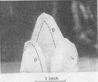 Millerite occurs as acicular crystal inclusions in bands in calcite, commonly in late calcite of stage one or in early calcite of stage two. The relations of millerite to octahedral galena crystals are shown in Figs. 6 and 7. The youngest galena commonly is in octahedrons, which may be perched upon millerite crystals or enclose them. Rarely is millerite surrounded by a hull of chalcopyrite, as shown in Fig. 12. Chalcopyrite more commonly occurs as bands of small discrete tetrahedrons closely associated with millerite within the first or second stage calcite. The millerite shows a remarkable symmetrical twinning, not previously noted in the literature (Figs. 8, 9, and especially 10, 11), which suggests a possible lower symmetry than rhombohedral scalenohedral class of the hexagonal system. Buerger (1947) has indicated a similar possibility in the case of dihexagonal dipyramidal pyrrhotite.