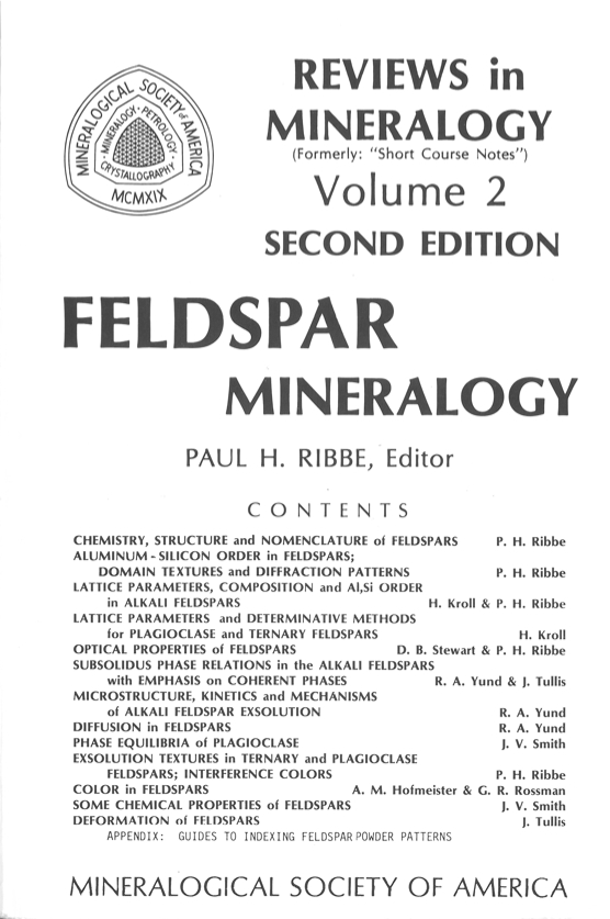 In October 1975 a Short Course on Feldspar Mineralogy was held at the Hotel Utah, Salt Lake City, in conjunction with the annual meetings of the Mineralogical Society of America. Richard A. Yund, David B. Stewart, Joseph V. Smith and Paul R. Ribbe presented workshops on x-ray single-crystal and powder diffraction methods and electron optical techniques as applied to the study of feldspars and presented eight lectures, the substance of which became the nine chapters of the first edition of Feldspar Mineralogy. That book was published by the Mineralogical Society as the second volume of its series entitled Short Course Notes.