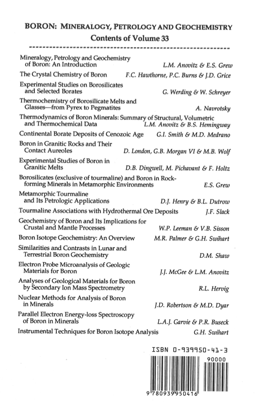 At the time of the first printing (1996), interest in the element boron was growing rapidly. We felt that it was an opportune moment to ask investigators active in research on boron to review developments in their respective fields so that readers could learn what was-and wasn't-known about boron and its minerals, geochemistry and petrology.